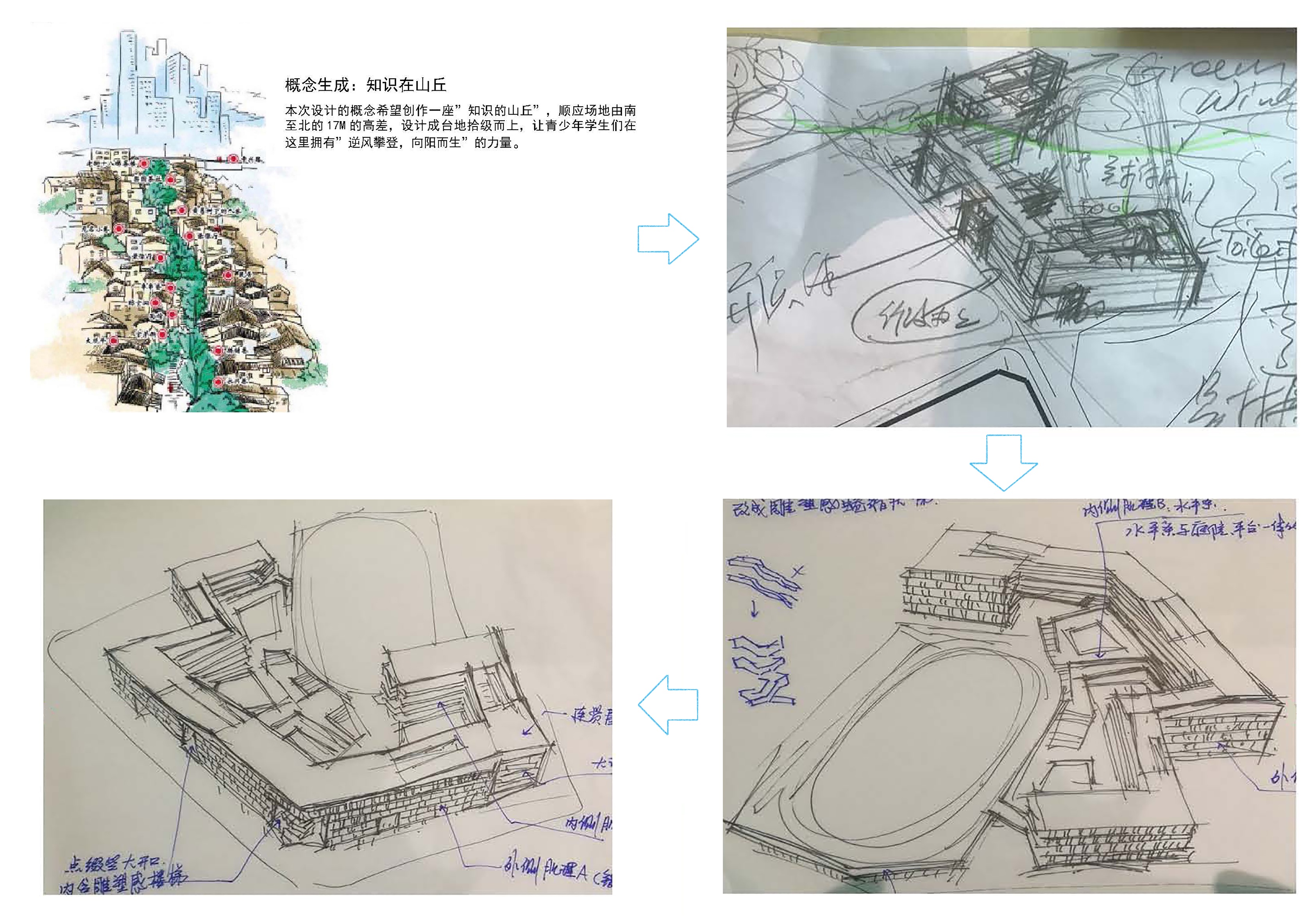 方能在學業上有所小成。我司深圳龍勝學校建筑方案以知識的山丘設計概念,將求學的攀登之路與項目的地形地貌相結合,為學校創作了一個寓理于景的立體式校園設計方案,以期展現莘莘學子勤勉求學的畫卷。