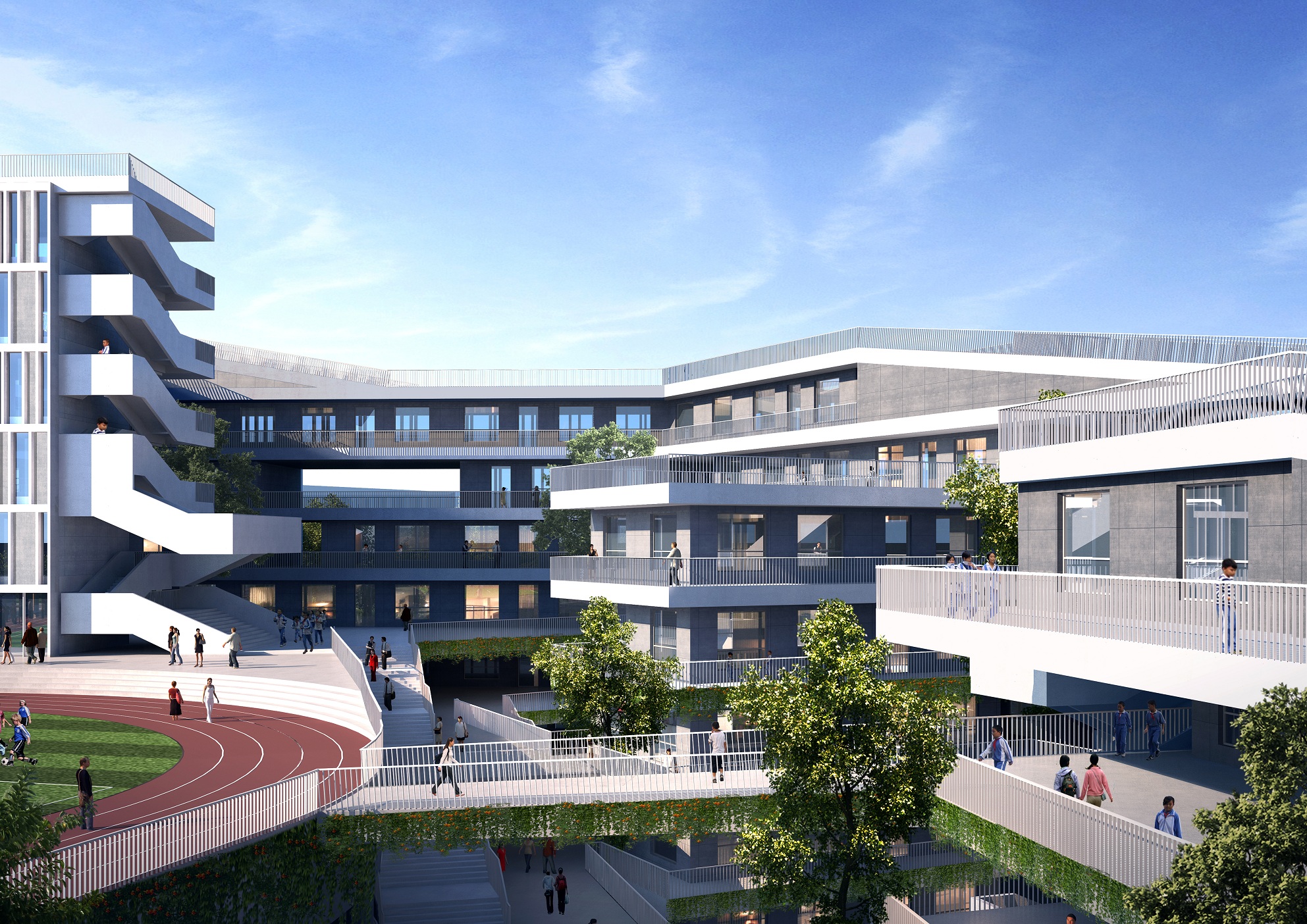 因地制宜的同時,方案也將先進的設計理念與校園建筑相融合。通過對教育發展變化的理解和預測,力求打造一個能長期服務于基礎教育的教學空間,對校園建筑設計的現代化、網絡化、綠色生態發展方面進行了深刻解讀。設計中盡可能地考慮到長遠的教學技術利用與更新,日常信息的交換與流通以及優美舒適的園林化校園環境的搭建,以期達到設計的前瞻性和校園建筑與周邊環境和諧共生的目標。